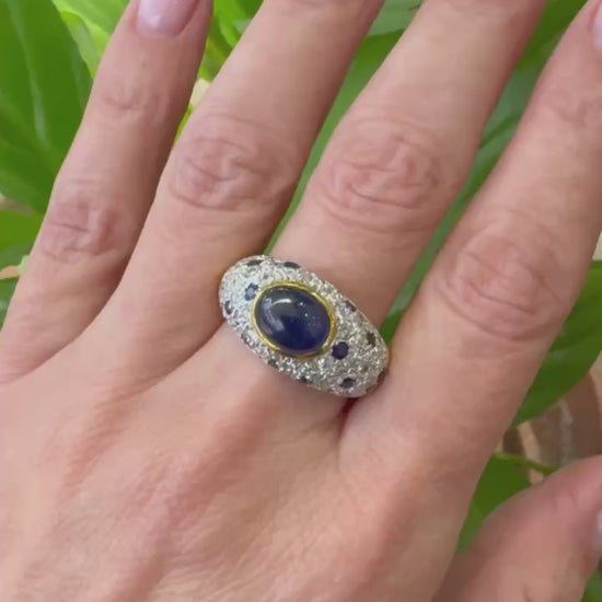 Oval Cabochon Blue Sapphire & Diamond Cluster Dome Dress Ring in 18 Carat Gold