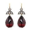 Victorian style drop earrings featuring a beautiful pear shaped garnet in each, coming to a combined weight of 5.00 carats. The beautiful gemstones hang beneath three rose cut diamonds, two set on leaf shaped mounts and the third one set above them on a round shaped mount, all connected to an 18K yellow gold secure fish hook fastening. The earrings are crafted from silver on 18K yellow gold and measure approximately 3.2cm in length. Tested silver and 18 carat yellow gold. England.