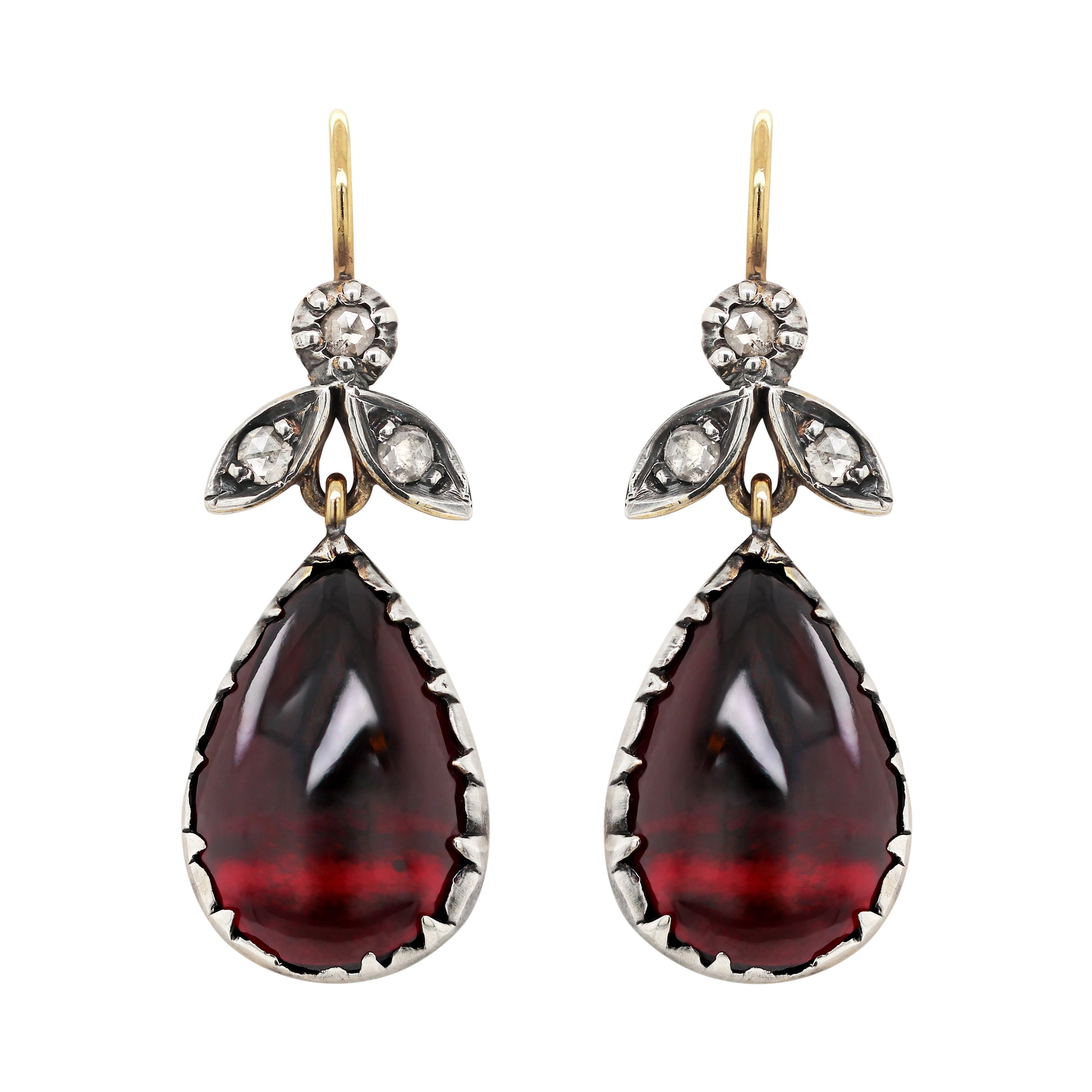Pear Cabochon Garnet and Diamond Silver on 18 Carat Gold Drop Earrings