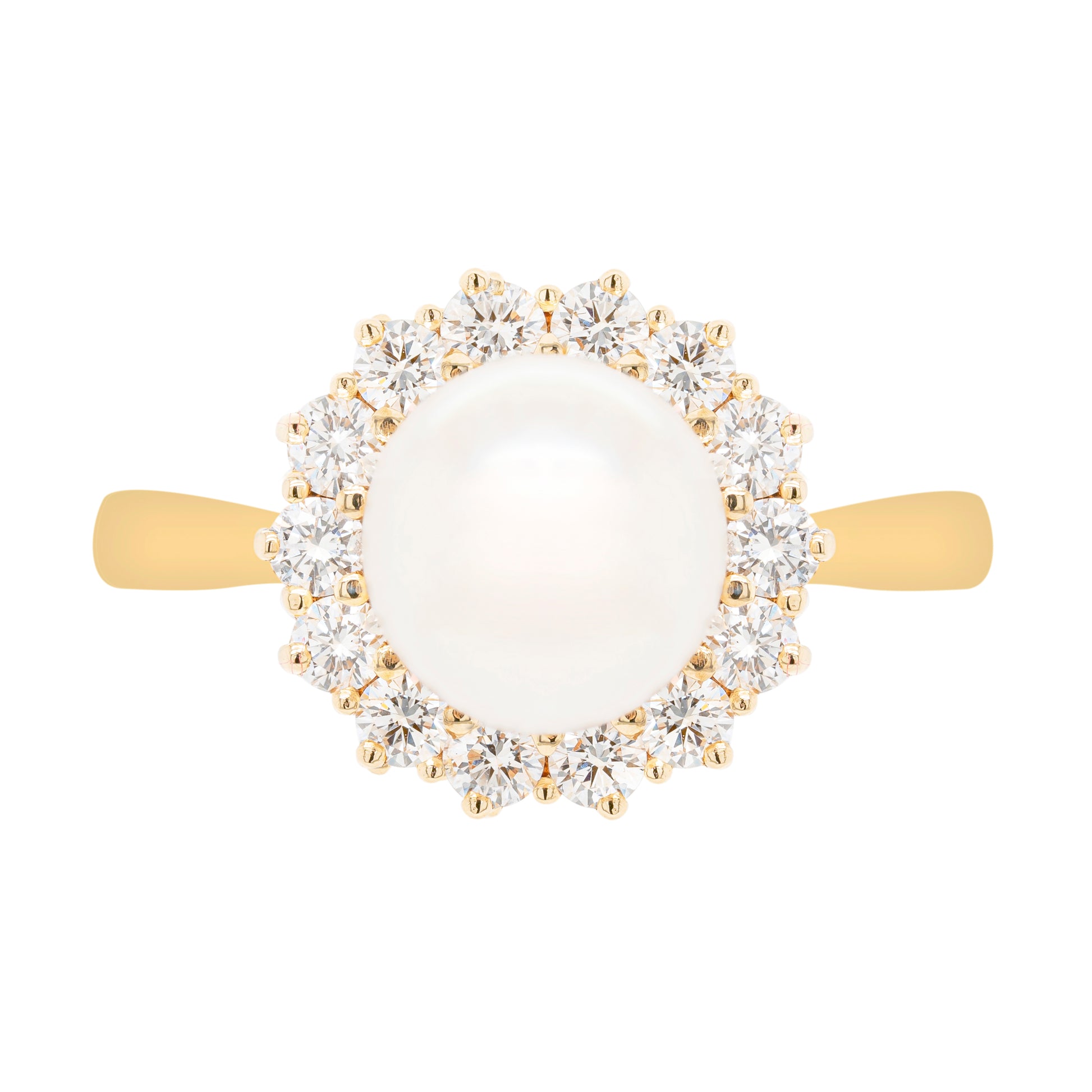 This exquisite and charming engagement ring features a beautiful white cultured pearl measuring 7.8mm, surrounded by 14 fine quality claw set round brilliant cut diamonds weighing approximately 0.70ct. The delicate cluster sits atop an 18 carat yellow gold fine tapered shank stamped 9085, C&F on the inside and hallmarked. UK finger size 'M'.