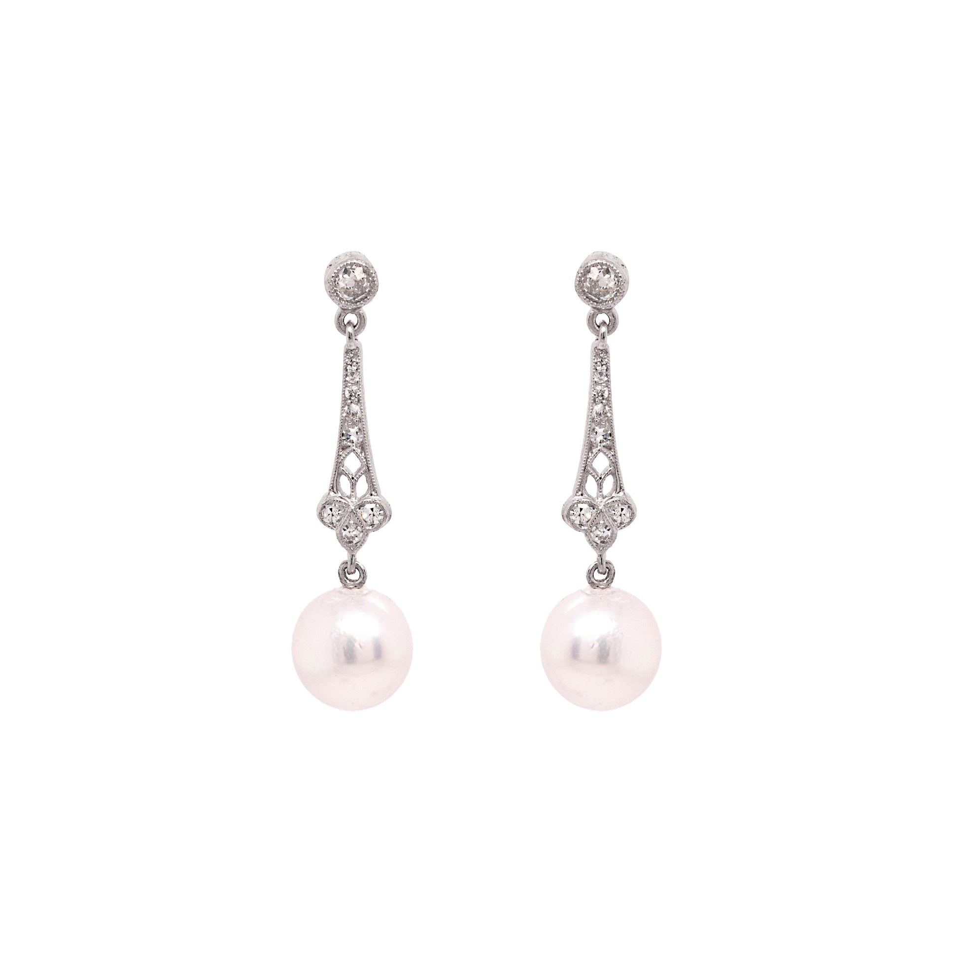 This exquisite pair of platinum drop earrings feature an intricate open work design beautifully adorned with 8 eight cut diamonds on each earring, all mounted in delicate milgrain settings. Above the open work mount there is a larger old cut diamond in a rub over milgrain setting, making the total diamond weight 0.28ct combined. The earrings are then finished with a lustrous cultured pearl on the ends of each drop, measuring approximately 8.3mm in diameter. The earrings measure 3cm in length, weight 3.66 grams combined and secure with a platinum bar and butterfly.