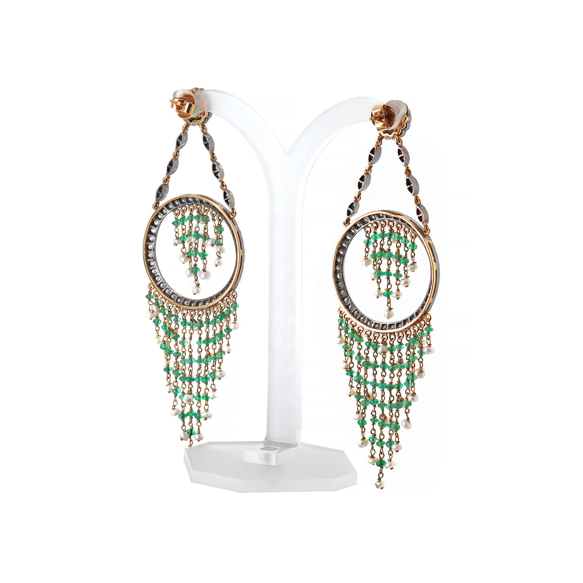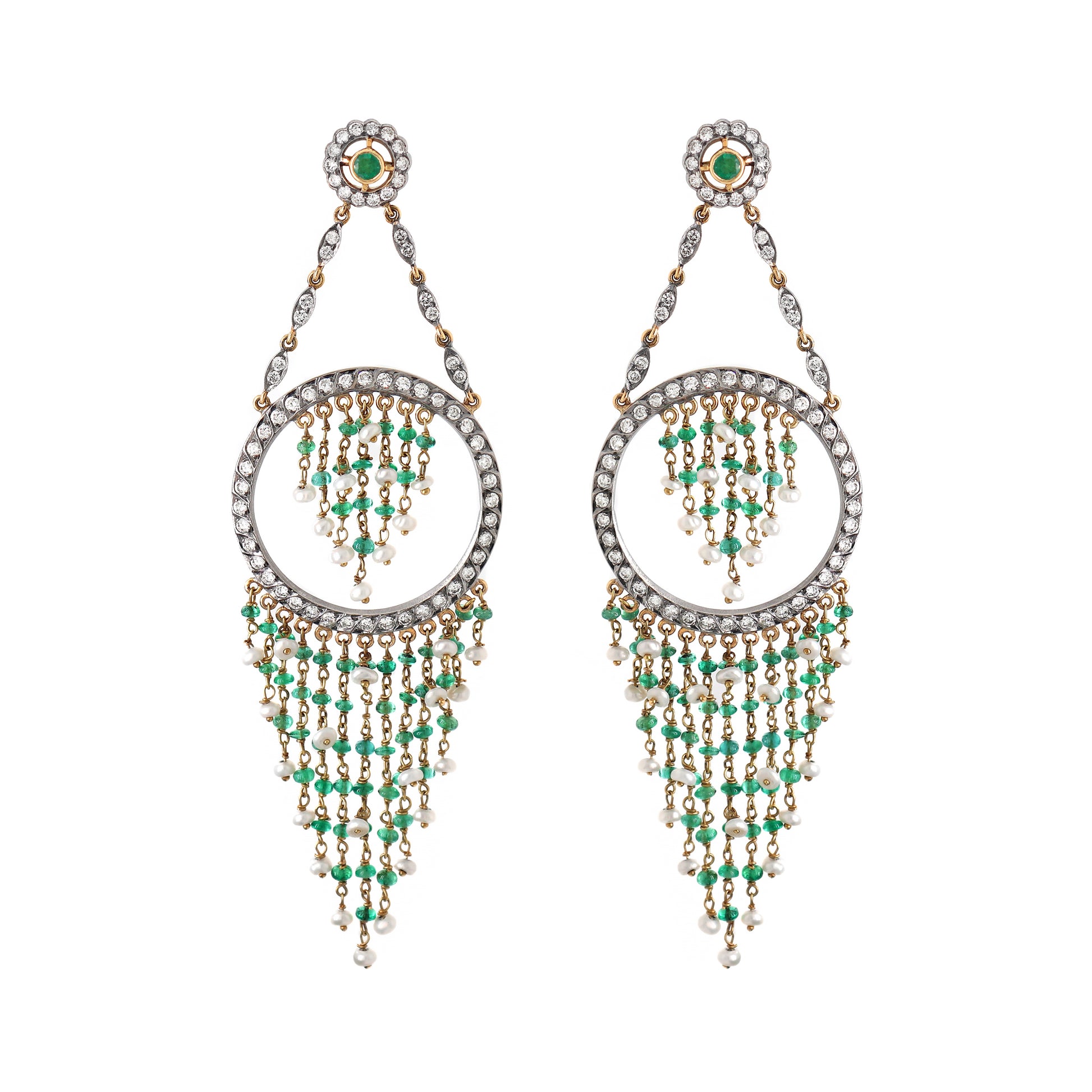 Pearl, Emerald and Diamond 18 Carat Gold Cascade Chandelier Earrings