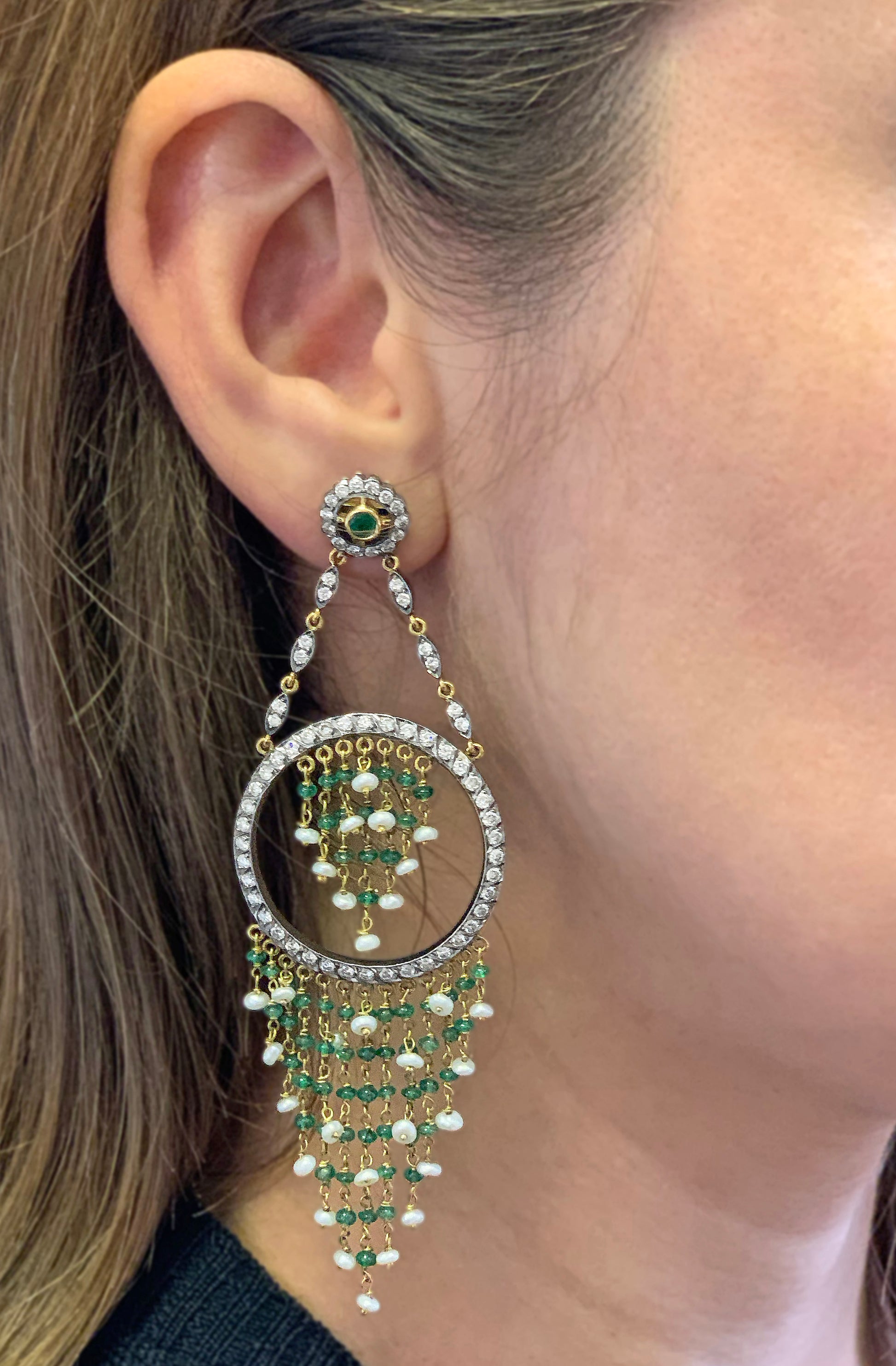 Beautiful hand made beaded chandelier earrings crafted from 18 karat yellow and white gold, featuring cascade tassel style emerald beads and baroque culture pearls. The edgings are hanging from a circle set with 40 round brilliant cut diamonds, which is also featuring cascade tassel style emerald beads and baroque culture pearls. The large circle hangs from a small emerald and diamond cluster fitted with a secure backing. The diamonds come to a total approximate weight of 2.80 carats. Tested 18K gold.