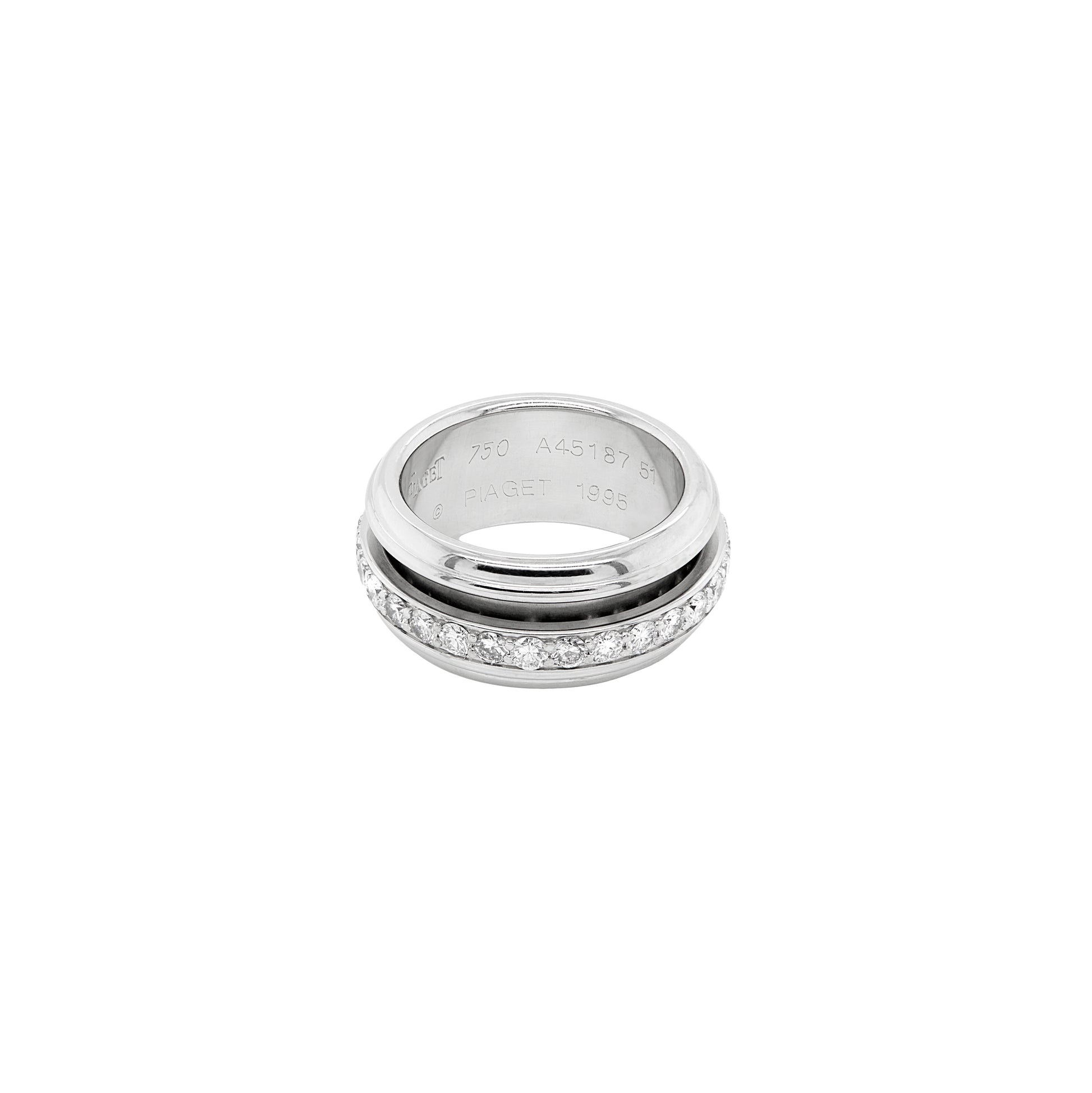 One of the standout features of this ring is its spinning mechanism, which allows the delicate outer band, set with approximately 1.20ct of fine quality round brilliant cut diamonds, to rotate smoothly around the inner band. This innovative design not only adds a playful touch to the piece but also showcases Piaget's commitment to pushing the boundaries of traditional jewellery design.