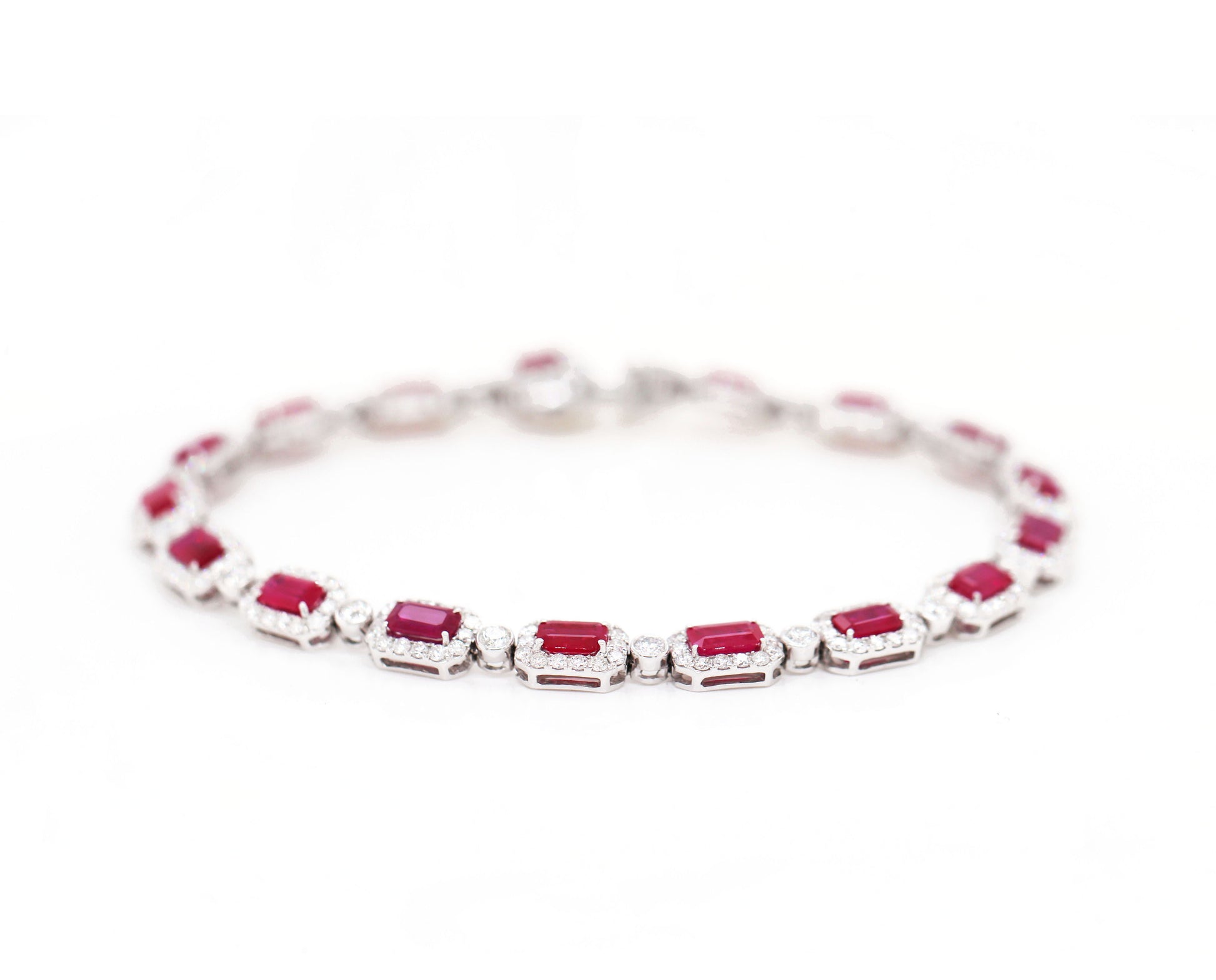 Bracelet featuring 17 fine quality emerald cut rubies weighing a total of 4.80ct all mounted in open back claw settings. Each ruby is surrounded by 14 round brilliant cut micro claw set diamonds also in open back settings all connected by a rub over round brilliant cut diamond. The total diamond weight on the bracelet is 3.00ct with a total of 254 diamonds, The bracelet measures 7.5 inches, hallmarked 750 18K.