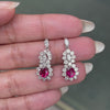 A beautiful pair of cluster earrings featuring a fine quality pear shaped ruby weighing approximately 0.55ct each in a three claw open back setting. The rubies are accompanied by a cluster of claw set marquise shaped diamonds and round brilliant cut diamonds with an approximate total weight of 1.68ct. All stones are claw set in 18 carat white gold.