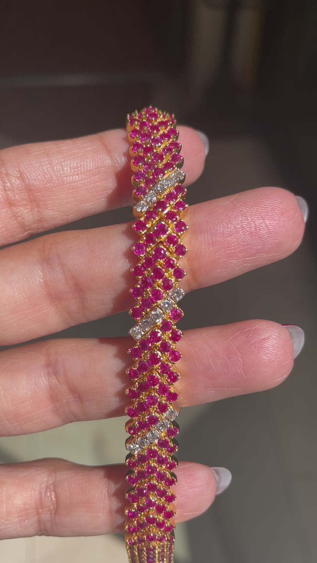 This wonderful bracelet features an impressive 239 round cut rubies, totalling to an approximate weight of 8.00 carats, all mounted in 18 carat yellow gold. The vibrant rubies are set in multiple oblique rows, beautifully interrupted by three rows of fine round brilliant cut diamonds, weighing approximately 0.70 carats in total. The bracelet measures 7 inches in length by 1cm in width and weighs 32.7 grams.