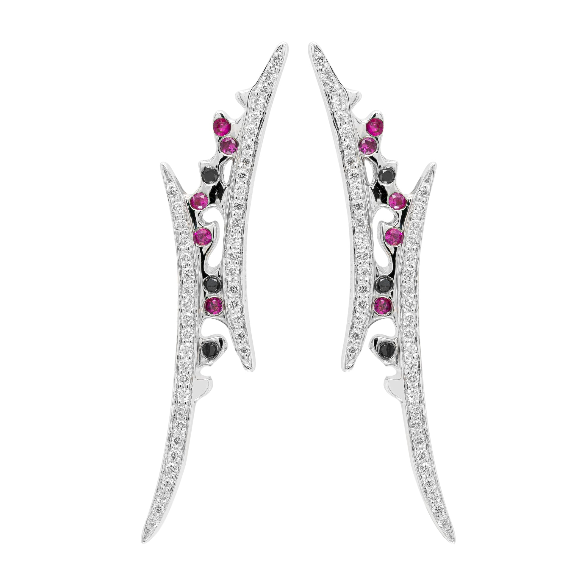 These 18 carat white gold abstract stud earrings feature two asymmetric pointed curved bars, inlaid with a total of 48 fine quality white round brilliant cut diamonds. The two bars are beautifully connected by a mix of 5 lively red round shaped rubies weighing a combined 0.13ct and 4 black round brilliant cut diamonds, bringing the total diamond weight to 0.38ct. English hallmark, stamped STARR.