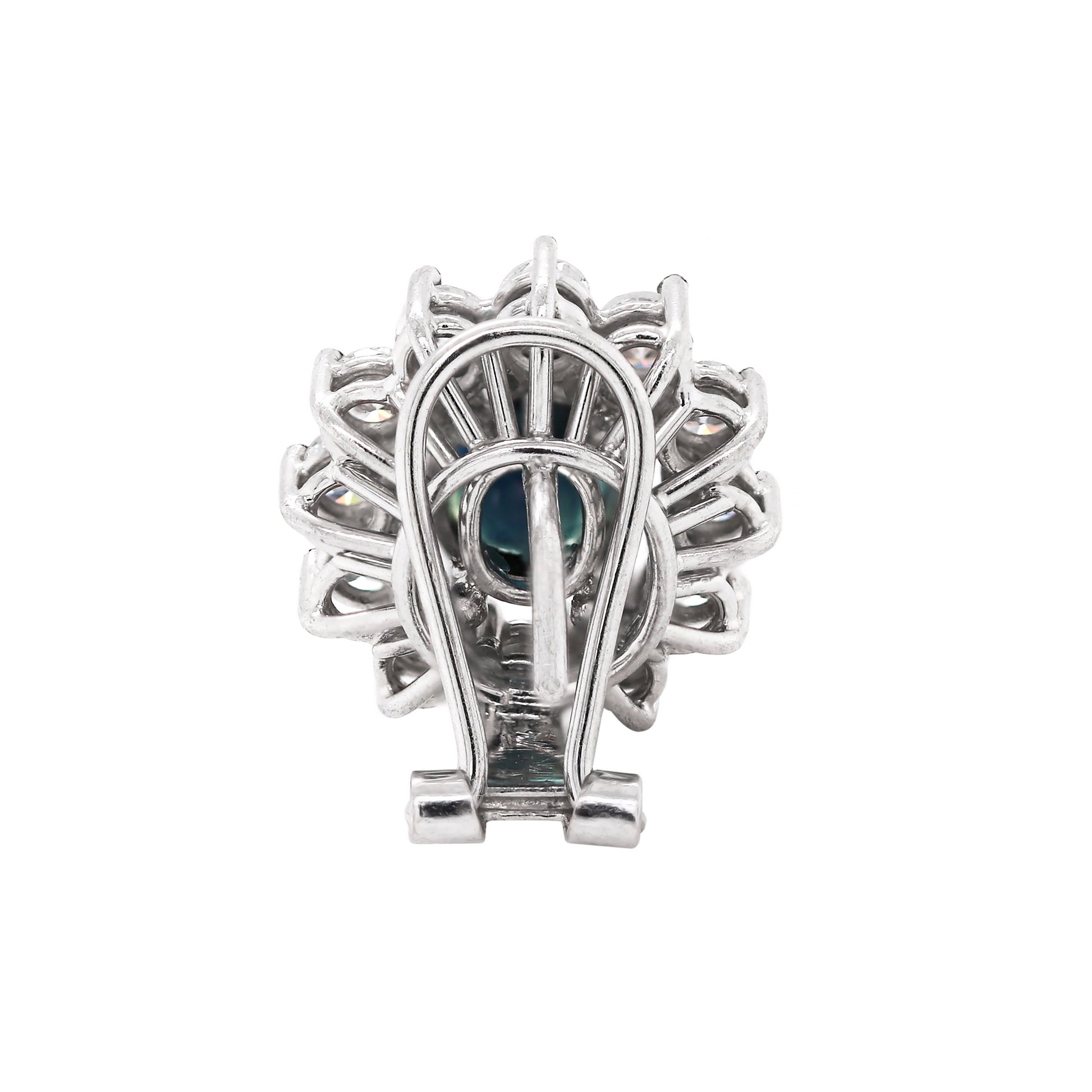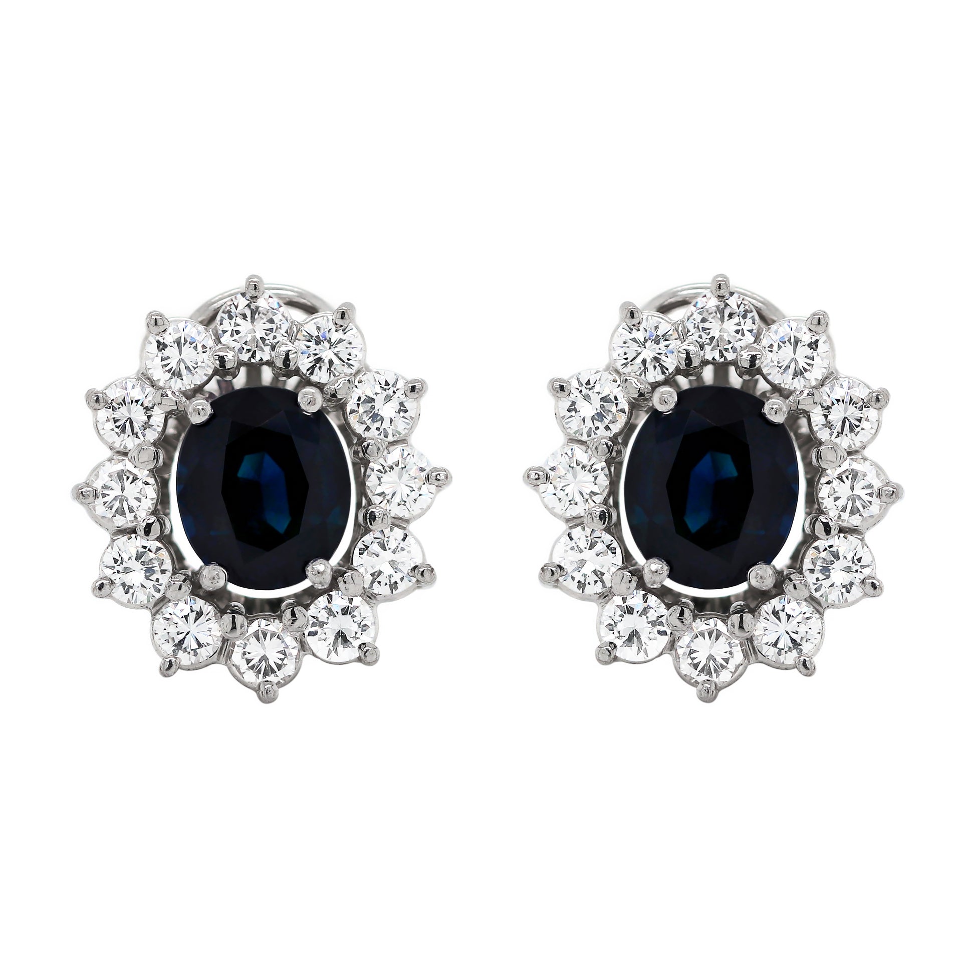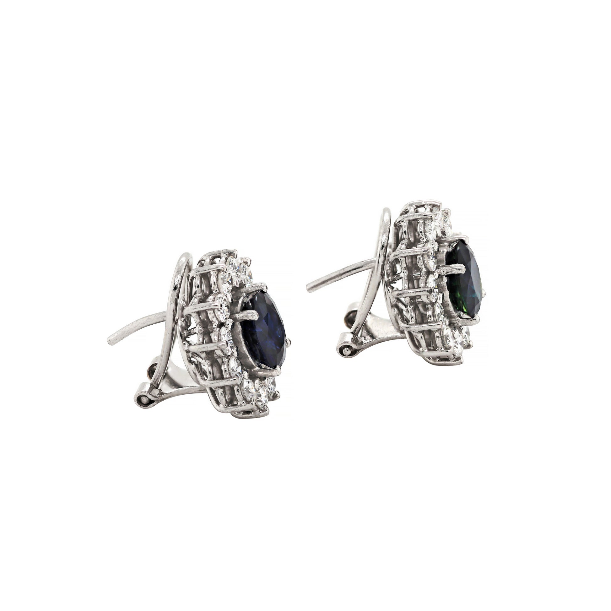 These classic cluster earrings feature an oval natural blue sapphire mounted in open back, four claw settings, weighing an approximate combined weight of 4.50ct. The sapphires are beautifully surrounded by 12 round brilliant cut diamonds, also claw set in open back settings, weighing a total combined approximate weight of 2.50ct. Mounted in 18 carat white gold, and fitted with a secure French clip back closure. Italy, circa 1990's.