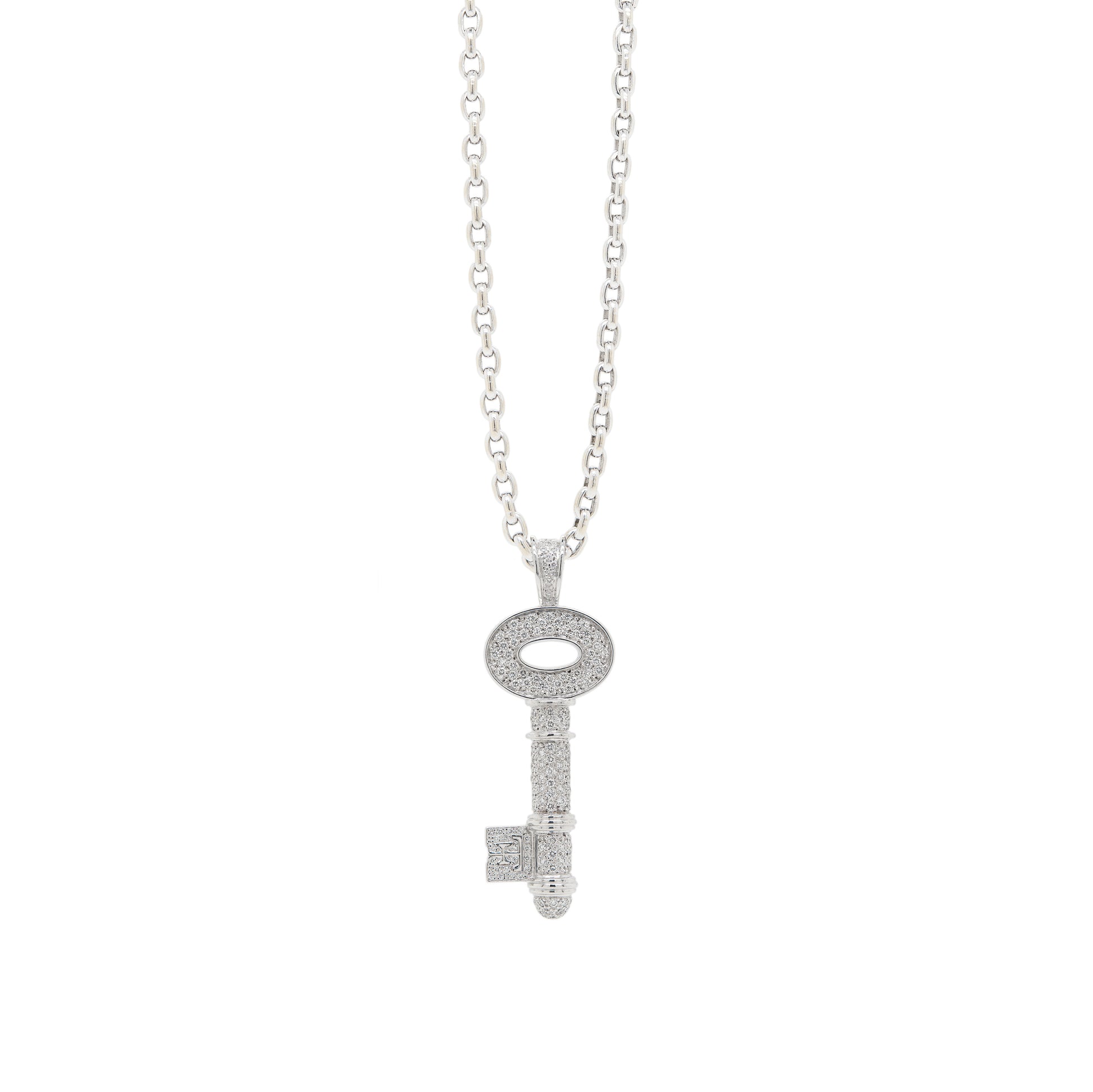 The necklace showcases an intricate key shaped pendant, masterfully crafted from luxurious 18 carat white gold. Its refined detailing is beautifully enriched by fine quality round brilliant cut diamonds, all expertly pavé set throughout the piece, with an estimated weight of 2.50ct.