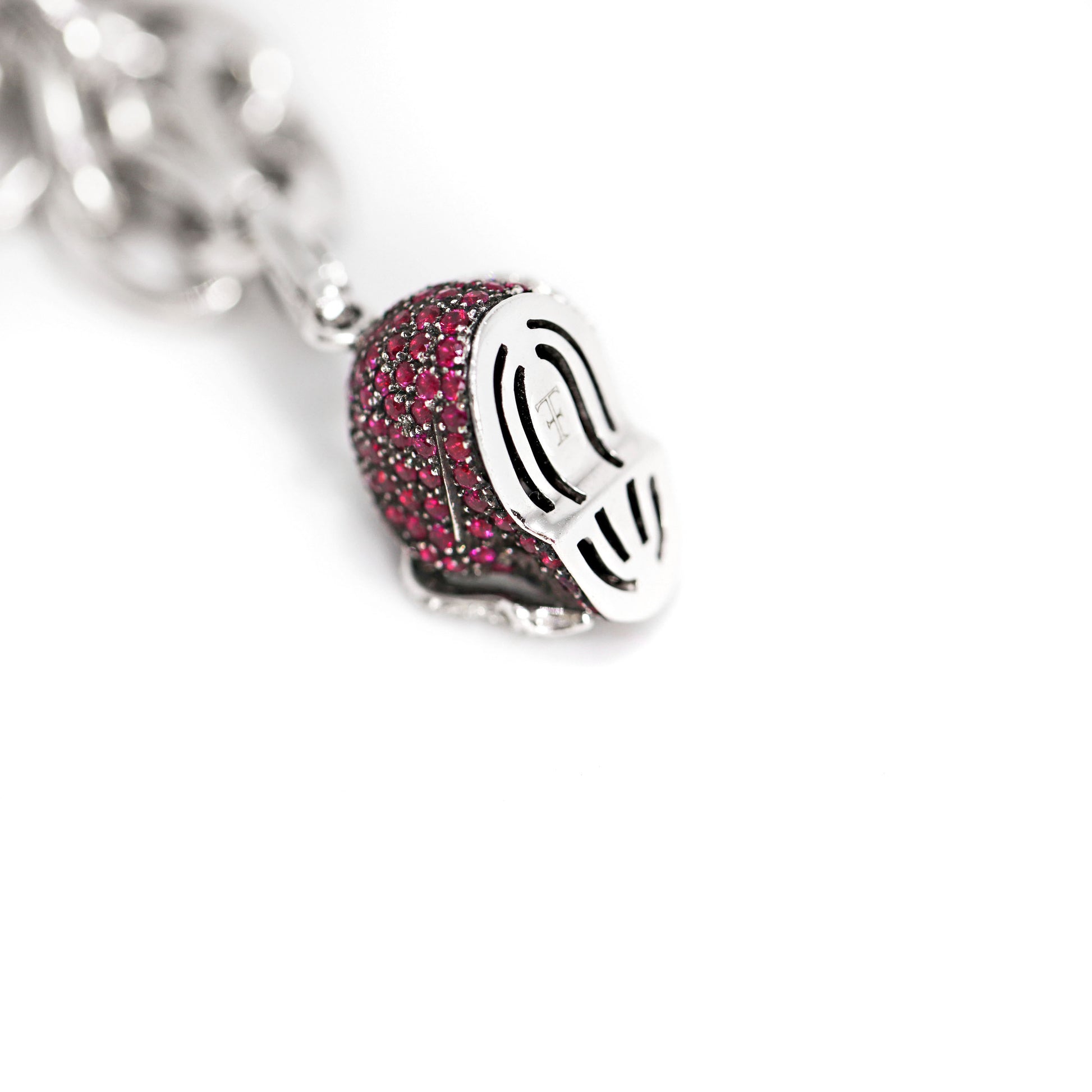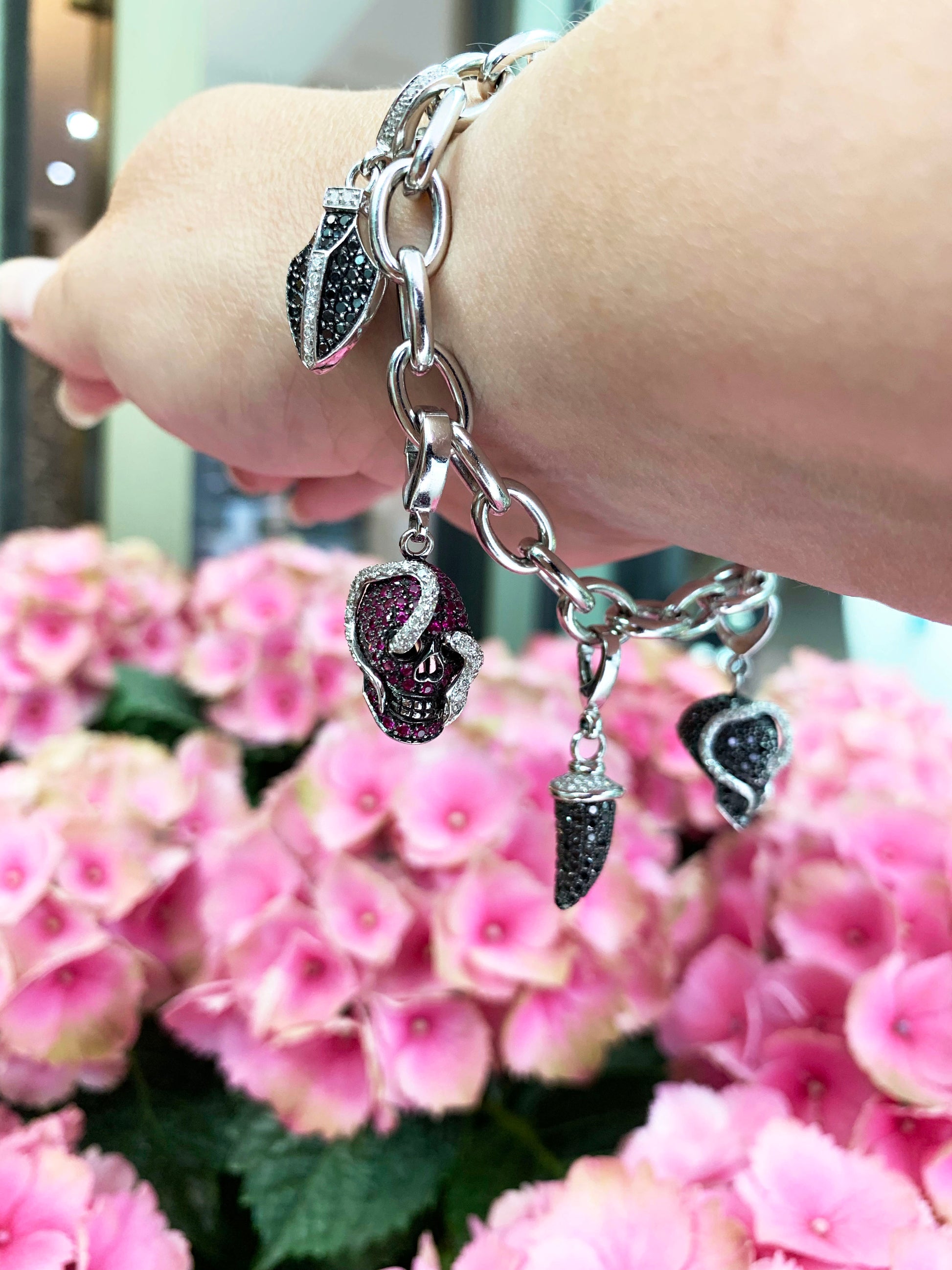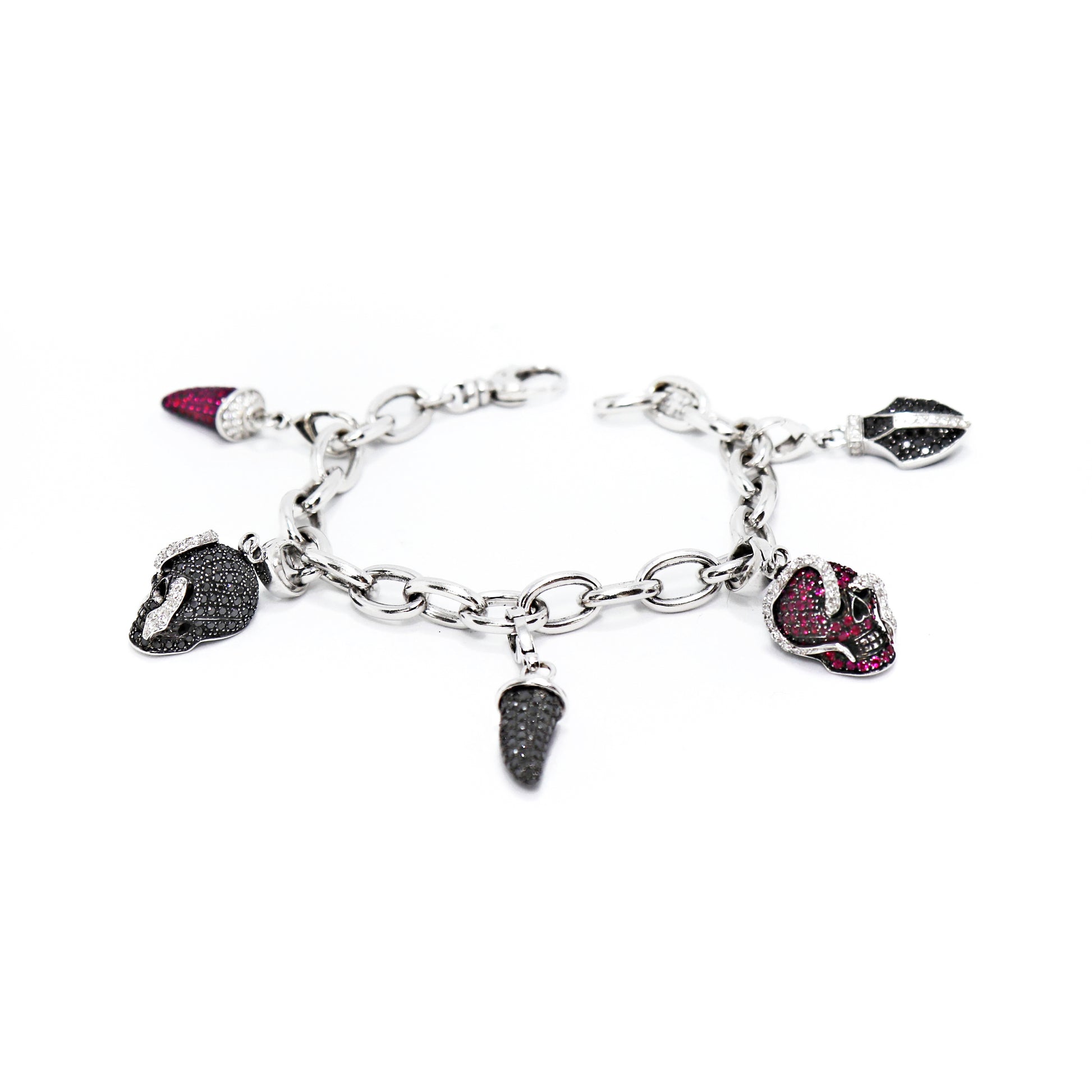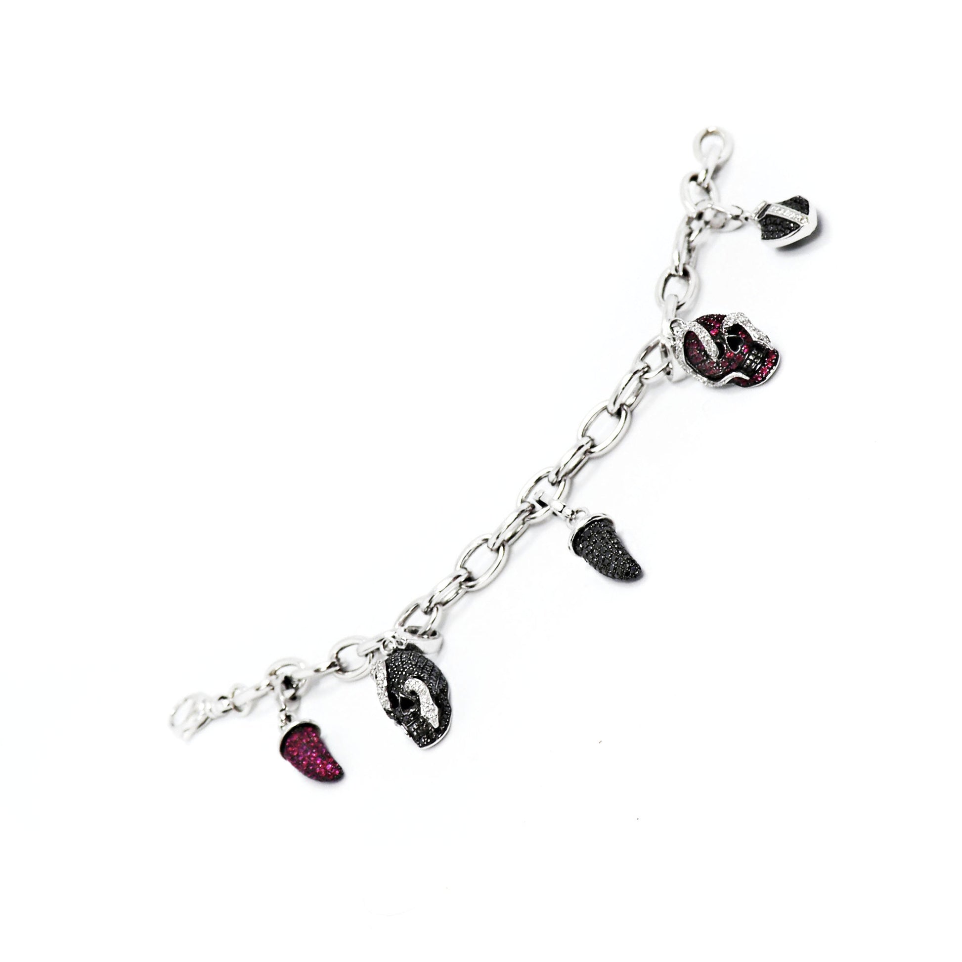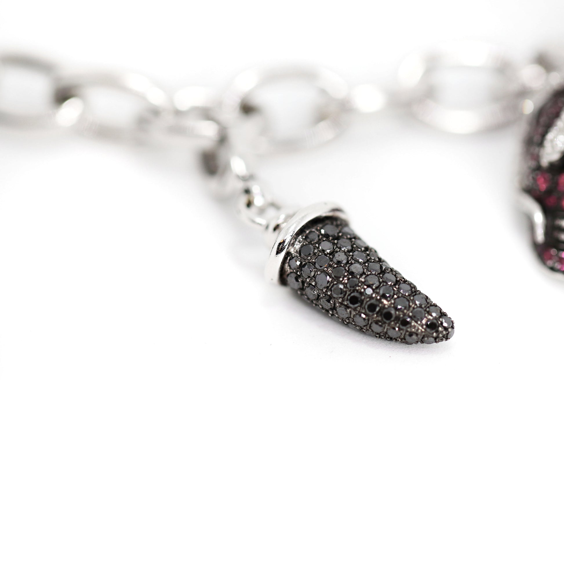 - 2 horns charms, one pavé set with black and white round brilliant cut diamonds and one set with rubies and white diamonds all mounted in 18ct white gold;