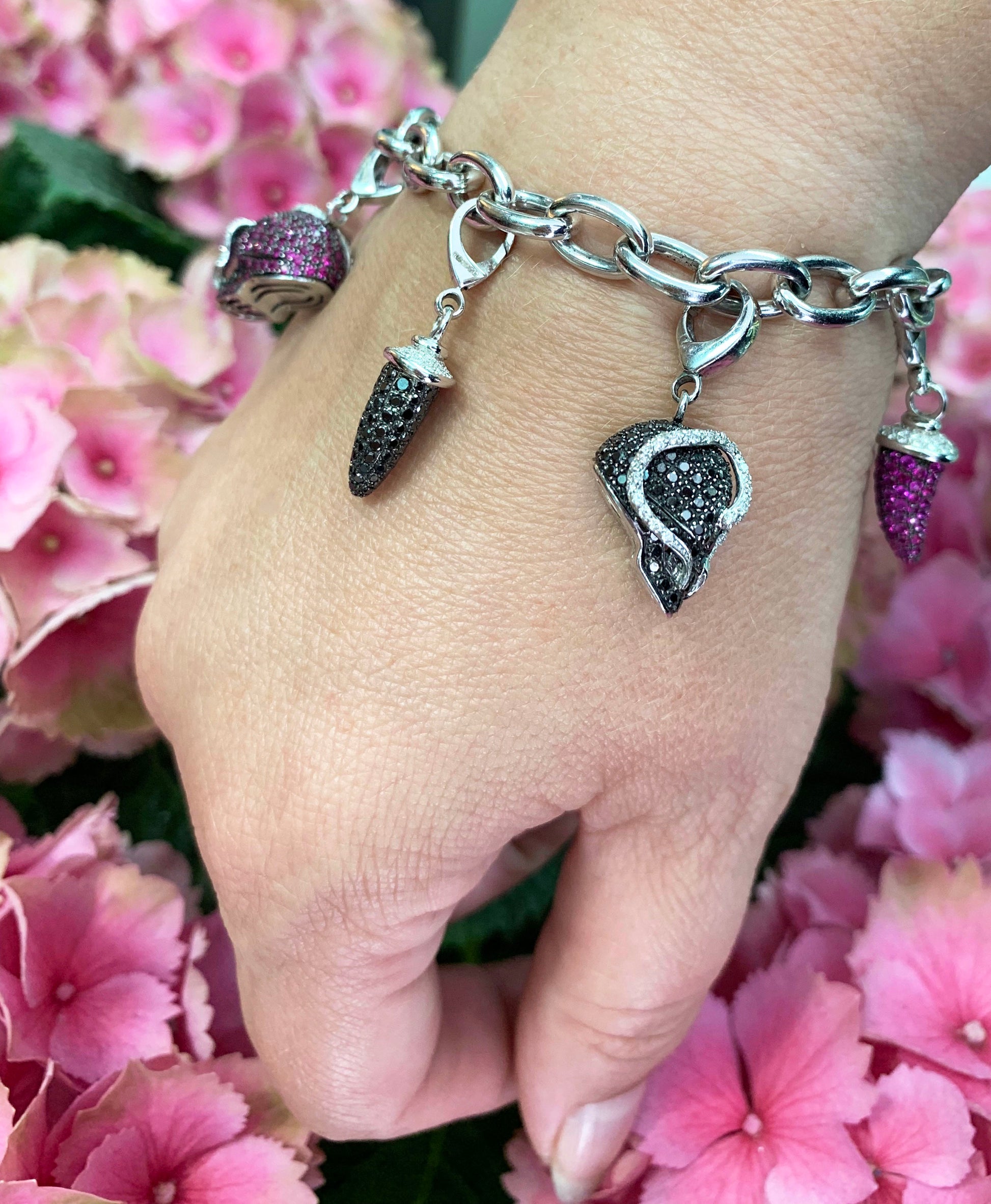 The charms beautifully hang from an 18 carat white gold chunky cable link bracelet measuring 7.3 inches in length with the signature Theo Fennell link.
