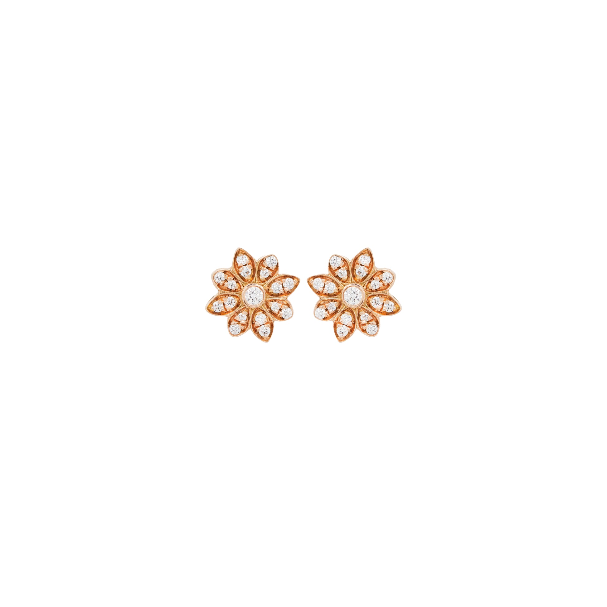 Crafted from warm 18 carat rose gold, these flower shaped treasures feature a rub-over set round brilliant cut diamond centre, with two additional diamonds set on each petal, creating a beautiful sparkle from every angle. The striking diamonds have a total combined weight of approximately 0.30ct across the pair.