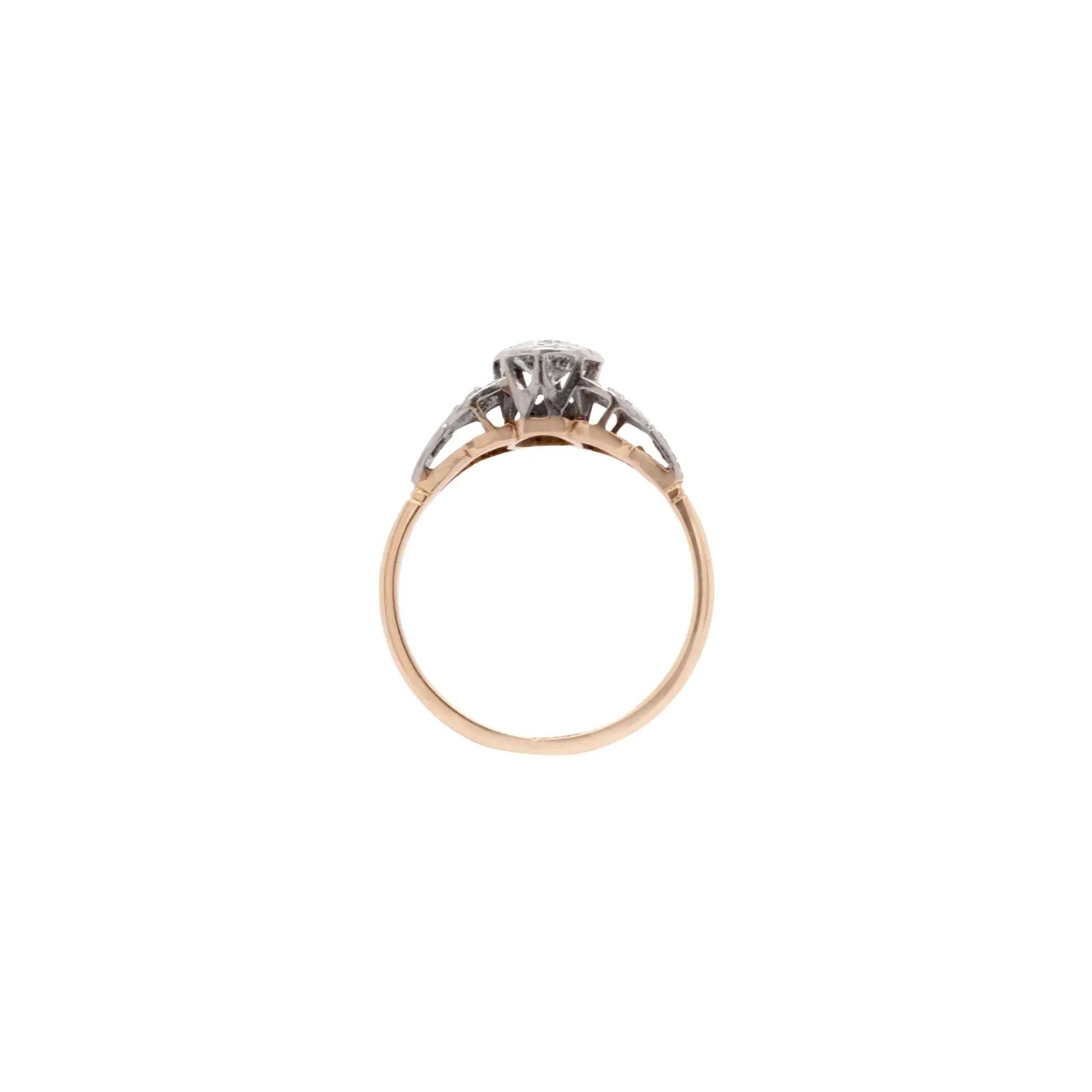 The band, crafted from 18ct yellow gold and features a delicate Deco style milgrain edged detailing and is decorated with 3 rose cut diamonds on either shoulder, that speaks to the craftsmanship of the era.
