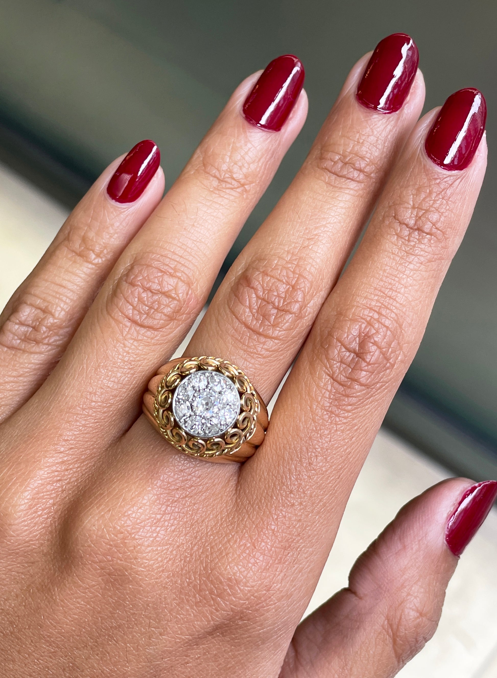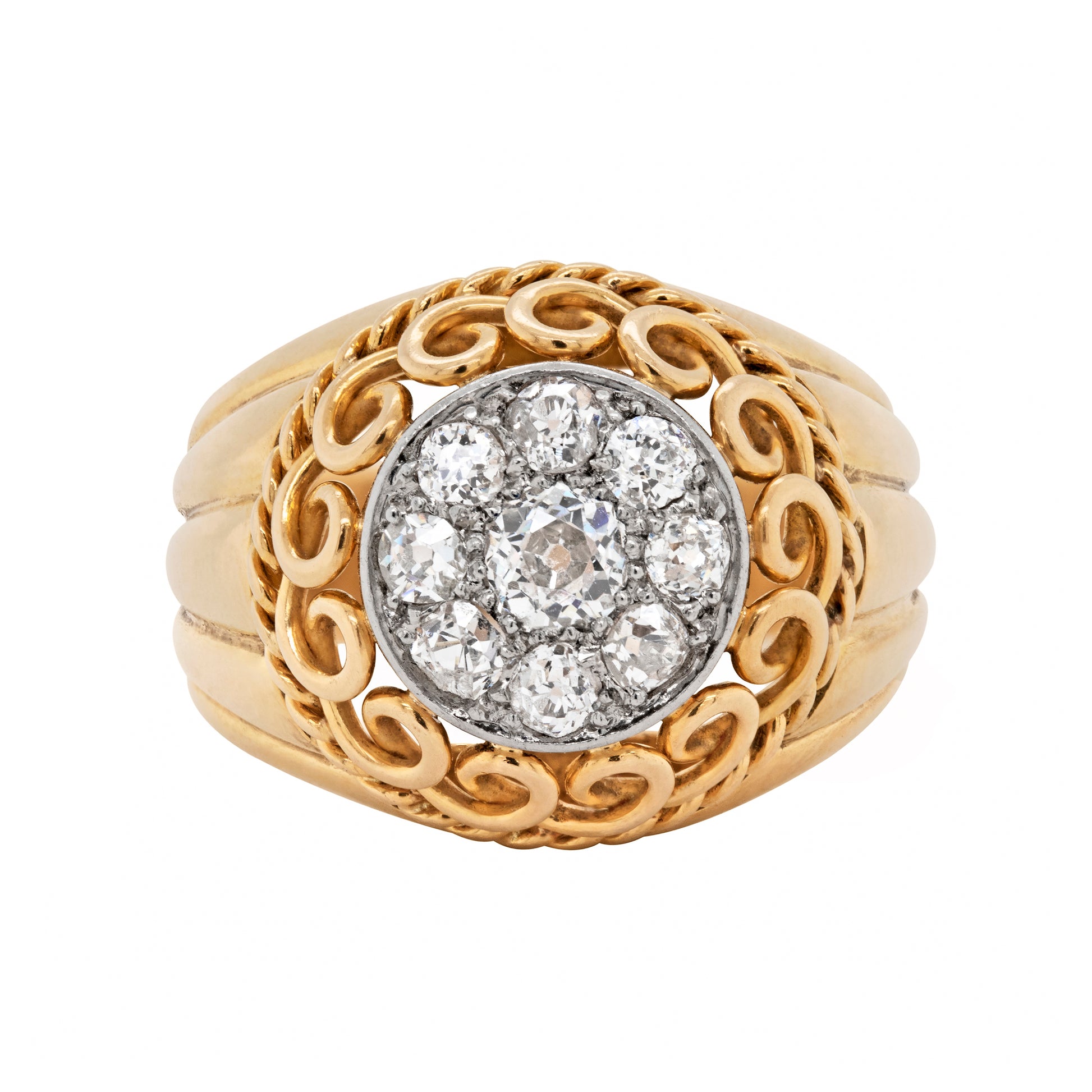 This handmade vintage domed ring is set with a 0.29ct old cut diamond in the center beautifully surrounded by 8 diamonds weighing approximately 0.78ct all pavé in a 18 carat white gold. The gorgeous cluster is set in the center of an openwork spiral designed border atop a wide tapered 18 carat yellow gold mount. French Hallmark. UK finger size 'O'.