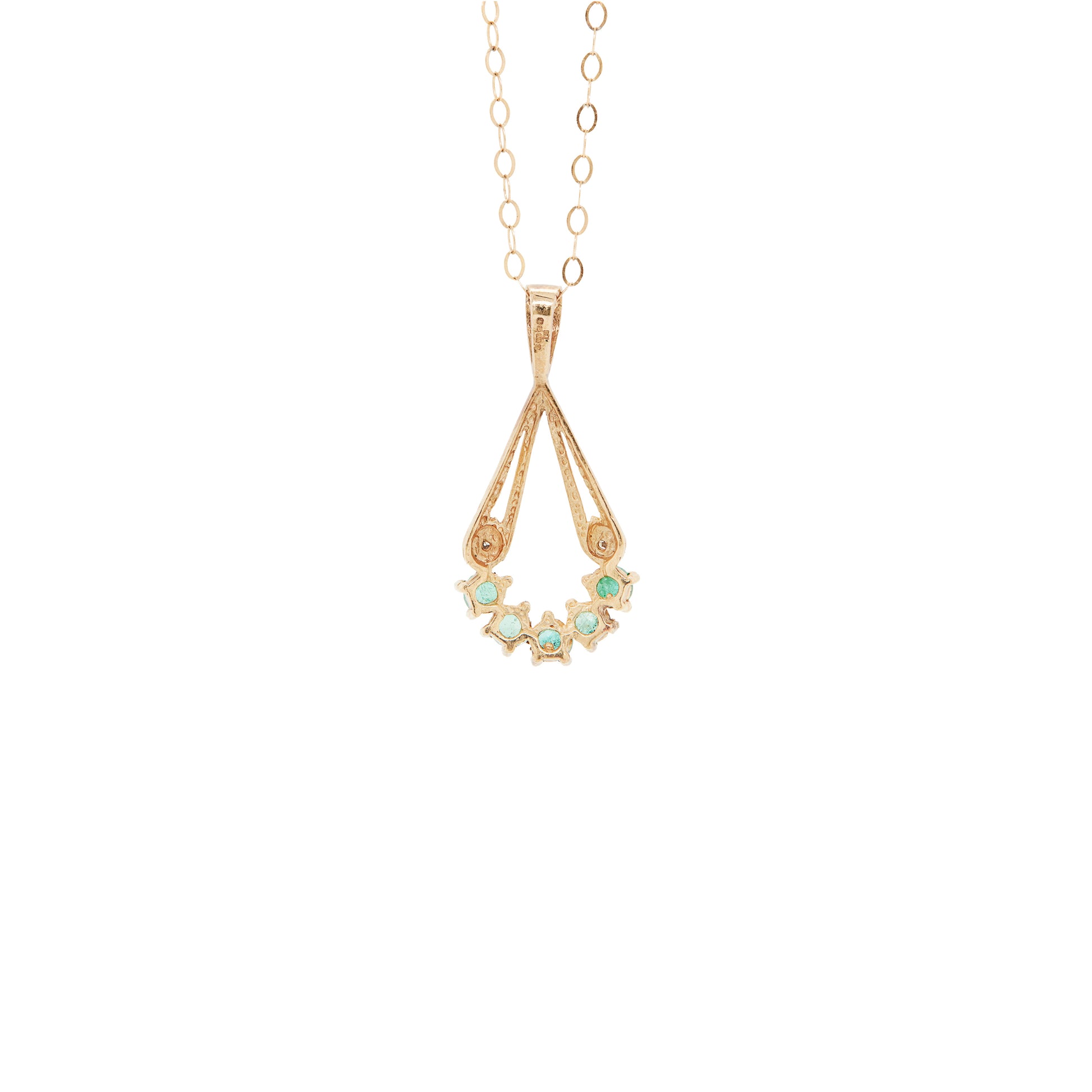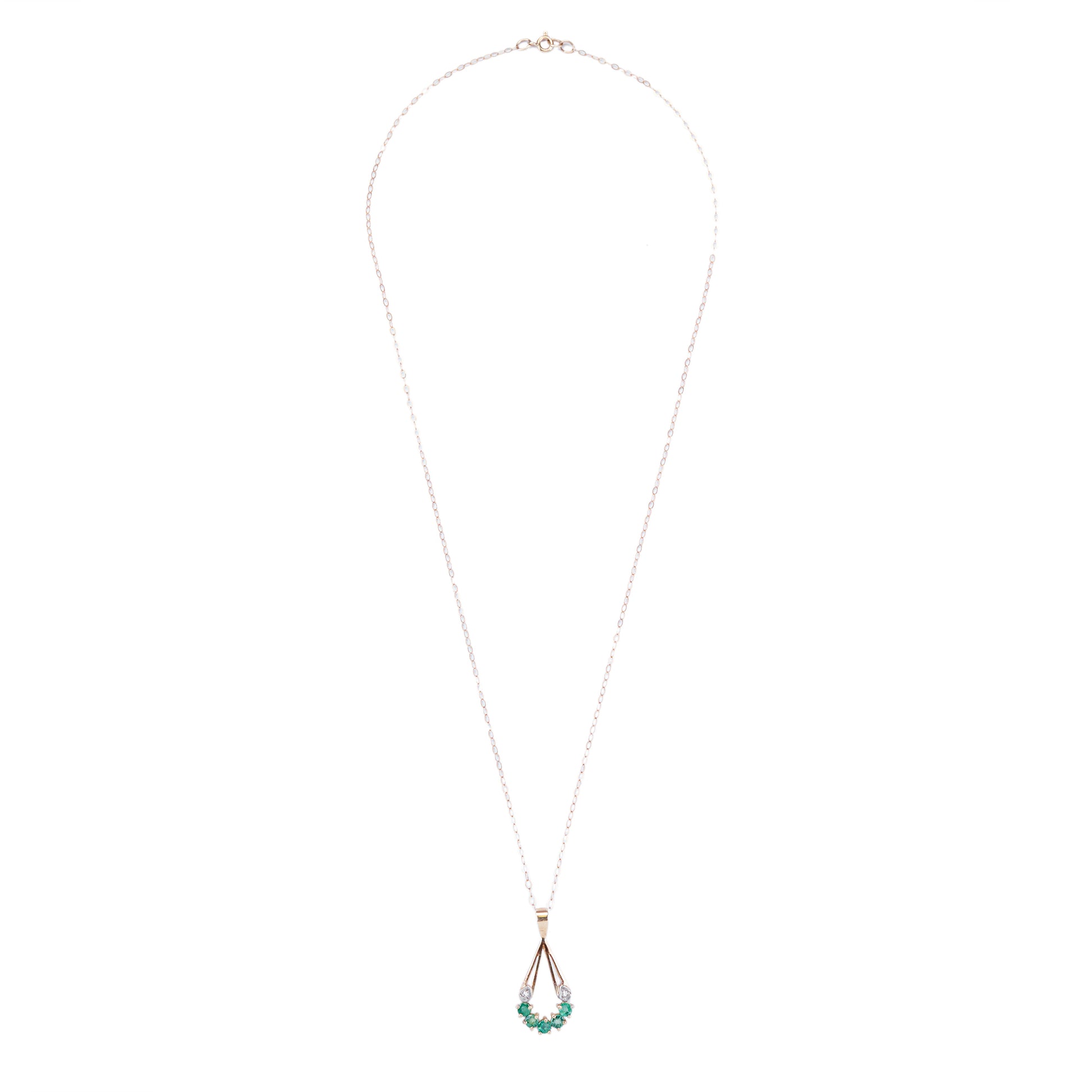 The pendant features an elegant open work drop design with two slender gold arms tapering down to 5 vibrant round emeralds, claw set in a graceful arc shape. Just above them, a sparkling eight cut diamond sits on each side in pear shaped white gold settings, adding a soft touch of sparkle and subtle contrast to the warm gold.