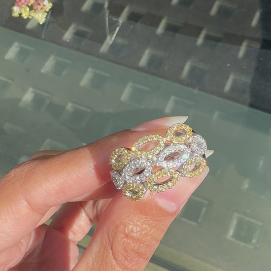The piece showcases an intricate infinity motif of interlocking loops, symbolising eternal love and continuity. Each curve is meticulously set with a sparkling array of precious stones: white round brilliant cut diamonds glisten along a central row, while the flanking rows shimmer with warm yellow round brilliant cut diamonds, creating a perfect harmony of colour and brilliance. With an estimated combined weight of 1.30ct, the diamonds offer a truly dazzling spectacle whenever the light catches them.